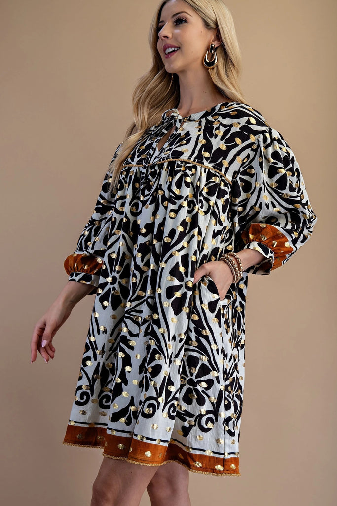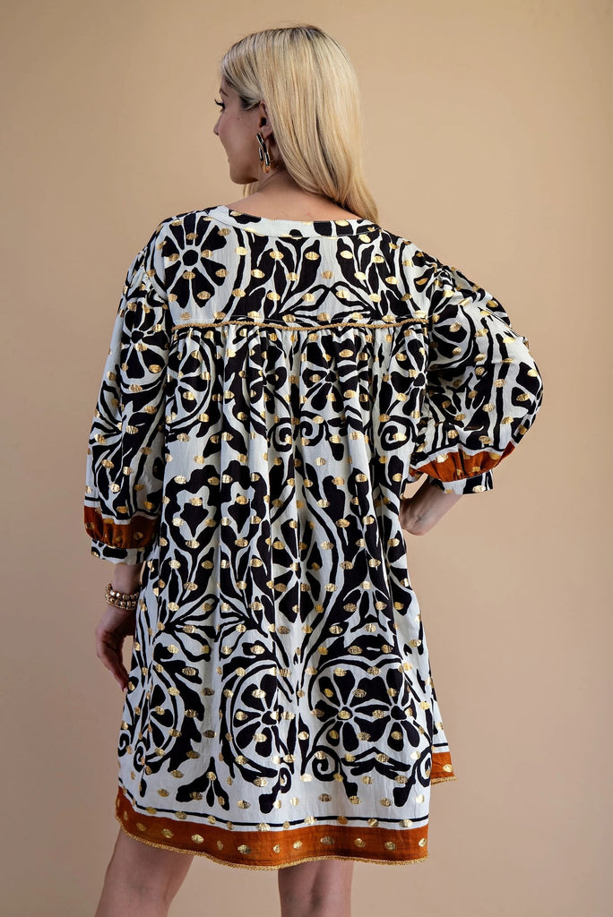 Black & Gold Accent Bohemian Dress. Relaxed Fit.