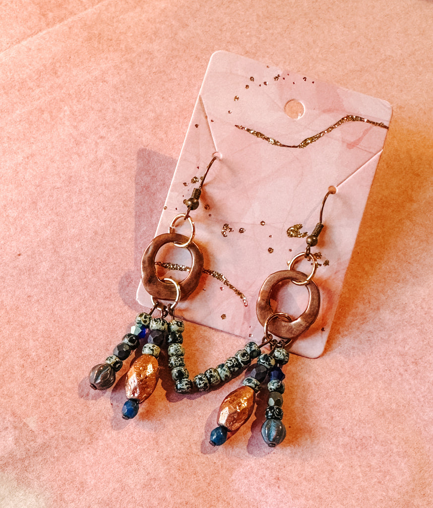 Copper & Green Blue Speckled Tassel Earrings. Hypoallergenic & Lead Safe.