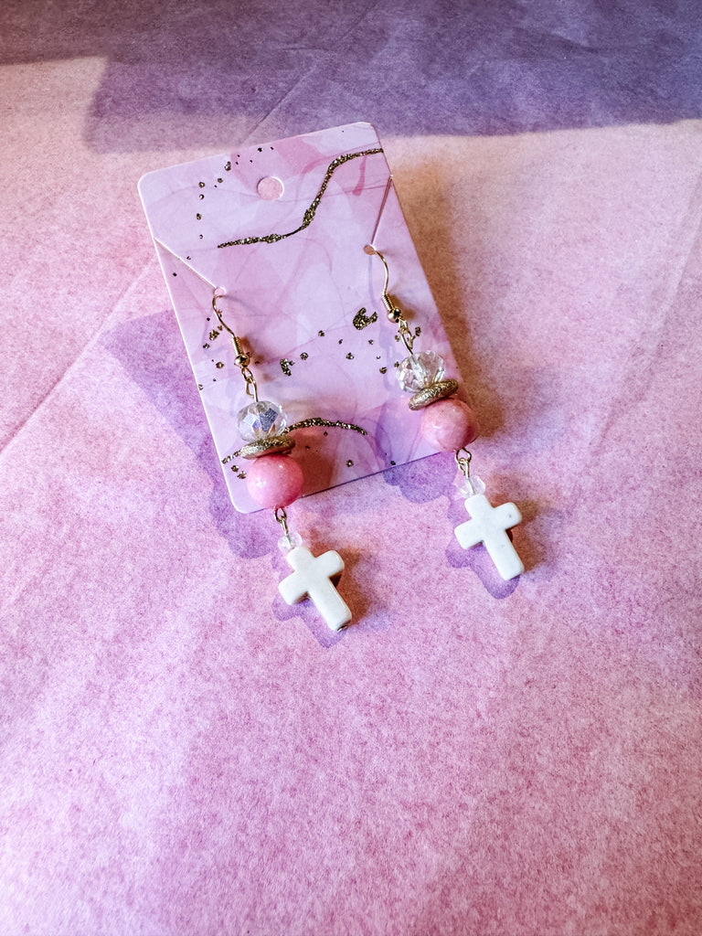 Pink & White Howlite Cross Earrings
